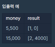 아이스 아메리카노는 한 잔에 5,500원이다. 머쓱이가 가진 돈 money가 매개변수로 주어질 때, 머쓱이가 최대로 마실 수 있는 아메리카노 잔 수와 잔액을 순서대로 담은 배열을 리턴하는 solution()을 완성하라