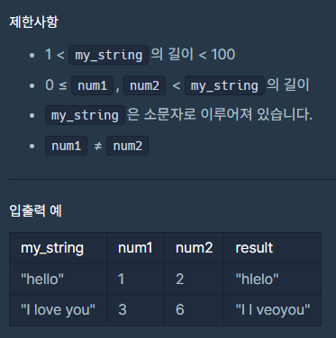 먼저 주먹구구식으로 풀어봤다. 임시 변수를 만들고 두 인덱스의 값을 서로 바꾼 다음 문자열로 만들어 리턴하는 코드인데 통과 처리됐다.