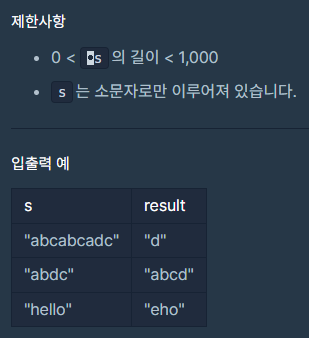 문자열 s가 매개변수로 주어집니다. s에서 한 번만 등장하는 문자를 사전 순으로 정렬한 문자열을 return 하도록 solution 함수를 완성해보세요. 한 번만 등장하는 문자가 없을 경우 빈 문자열을 retur