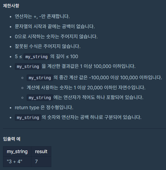 my_string은 "3 + 5"처럼 문자열로 된 수식이다. 문자열이 매개변수로 주어질 때 수식을 계산한 값을 리턴하는 solution()을 완성하라