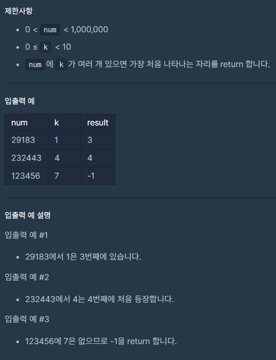 정수 num, k가 매개변수로 주어질 때, num을 이루는 숫자 중 k가 있으면 num의 그 숫자가 있는 자리수를 리턴하고 없으면 -1을 리턴하는 solution()을 완성하라