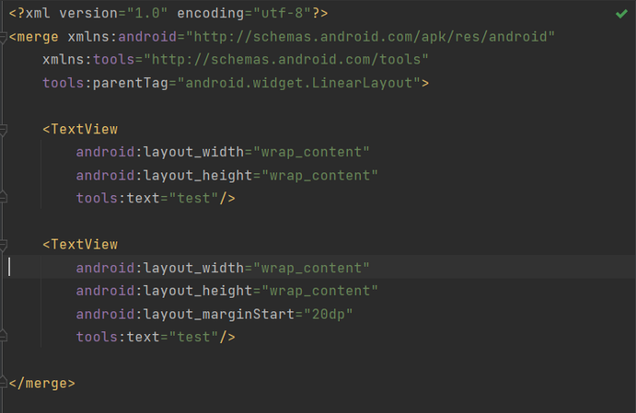 이 때 <merge> 태그를 쓸 수 있다. 이 태그는 한 레이아웃을 다른 레이아웃에 포함시킬 때 뷰 계층 구조에서 중복 뷰그룹을 제거하는 데 도움을 주는 태그다.