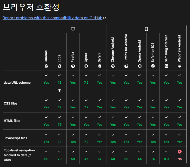 아래는 위 MDN 사이트에서 제공하는 브라우저 호환성 표다. 안드로이드 웹뷰를 제외한 다른 브라우저에선 모두 지원하는 걸 볼 수 있다.
