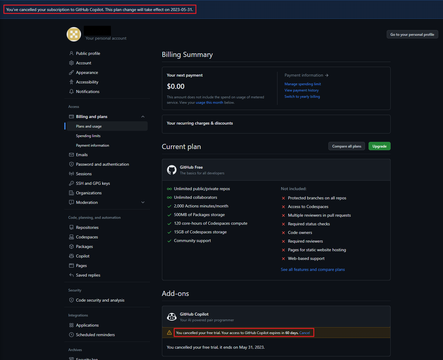 빨간 박스로 표시한 부분이 새로 표시된다. 파란 박스 안의 문구는 코파일럿 구독 취소했고 이 변경은 23년 5월 31일부터 적용된다는 뜻이다. 누리끼리한 박스 안의 문구는 코파일럿 무료 평가판을 취소했고 코파일럿 체험판은 60일 뒤에 만료된다는 내용이다.