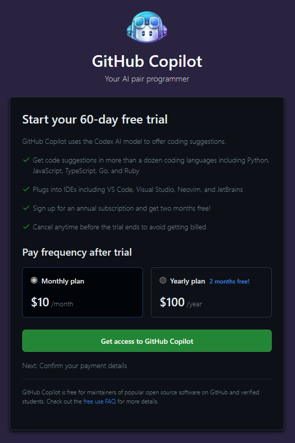 등록하고 처음 60일 간은 무료로 사용할 수 있다. 즉 코파일럿을 처음 결제하는 사람이라면 지금 보이는 월 10달러 플랜이든 연 100달러 플랜이든 선택한 후 결제해도 일단 공짜로 써볼 수 있다는 뜻이다. 연 100달러 플랜을 쓰더라도 옆의 파란 글자를 보면 2달 동안만 무료로 쓸 수 있다는 문구가 있으니 참고한다.
