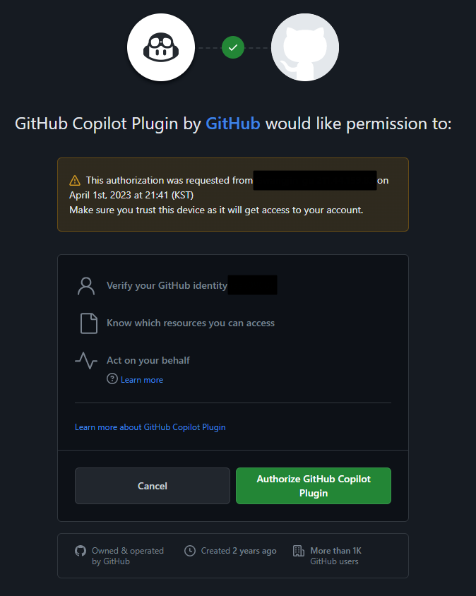 누리끼리한 박스 안에 대충 "이 인증이 몇 시 몇 분 OO구의 어떤 아이피에서 요청됐다"는 경고 문구가 표시되면서 밑에 자신의 깃허브 아이디가 나온다. 무시하고 녹색 버튼을 누른다.