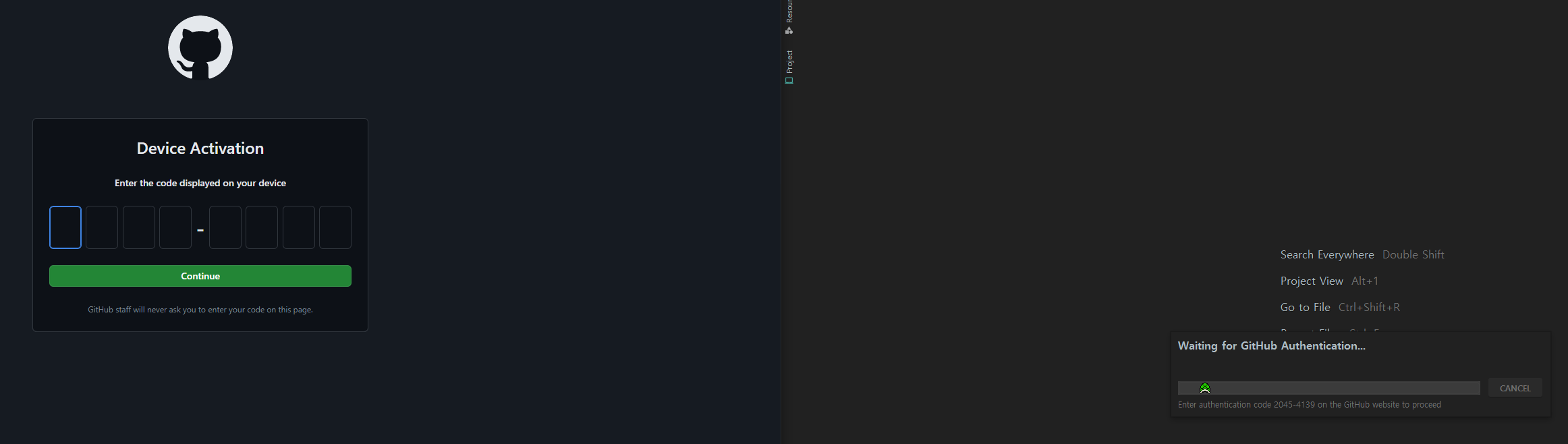 그러면 안드로이드 스튜디오에는 로딩 팝업이 뜨고 브라우저에는 인증번호를 입력하라는 창이 표시된다. 첫 글자 입력 부분을 클릭하고 Ctrl + V를 누르면 Device code가 붙여넣기된다. 그러면 밑의 Continue를 누른다.