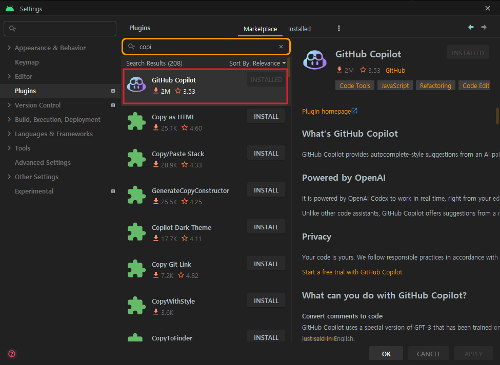 다음으로 안드로이드 스튜디오에서 코파일럿 플러그인을 설치해야 한다. 윈도우를 쓴다면 Ctrl + Alt + S를 눌러서 설정 창을 연 뒤 플러그인에 코파일럿을 검색해서 설치한다.