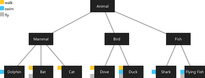 3개의 하위 클래스(Mammal, Bird, Fish)가 있는 상위 클래스 Animal이 있다. 맨 밑에는 concrete class가 있다. 작은 사각형은 행동을 나타낸다. 파란 사각형은 이 동작이 있는 클래스의 인스턴스가 수영할 수 있음을 나타낸다. 일부 동물은 공통적인 행동을 한다. 고양이, 비둘기는 다 걸을 수 있지만 고양이는 날 수 없다. 이런 종류의 동작은 이 분류와 직교하므로 슈퍼클래스에서 이런 동작을 구현할 수 없다. 한 클래스가 하나 이상의 슈퍼클래스를 가질 수 있다면 간단할 것이다. Walker, Swimmer, Flyer의 3가지 다른 클래스를 구현할 수 있다. 그 후에는 Walker 클래스에서 Dove, Cat을 상속받기만 하면 된다. 그러나 Dart에선 Object를 제외한 모든 클래스에 정확히 하나의 슈퍼클래스가 있다. Walker 클래스에서 상속하는 대신 인터페이스처럼 구현할 수 있지만 여러 클래스에서 동작을 구현해야 해서 좋은 솔루션이 아니다. 여러 클래스 계층 구조에서 클래스 코드를 재사용하는 방법이 필요하다. 믹스인은 여러 클래스 계층 구조에서 클래스 코드를 재사용하는 방법이다...(중략)