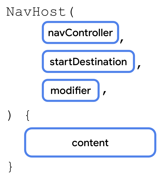 NavHost는 지정된 경로 기반으로 다른 컴포저블 대상을 표시하는 컴포저블이다. 위 코드에선 경로가 Write라면 Todo를 작성하는 화면을 표시한다. 아래는 NavHost 문법을 간략화한 그림이다.
