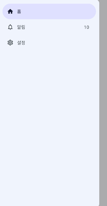 그리고 drawerState 매개변수로 처음에 DrawerValue.Closed로 설정한 drawerState 변수를 넘김으로써, 앱을 실행했을 때 NavigationDrawer가 닫혀 있는 상태로 표시되도록 했다. 만약 열린 상태로 실행하고 싶으면 Closed를 Open으로 바꾸면 된다. 그러나 보통 Closed 값을 많이 쓰게 될 것이다.