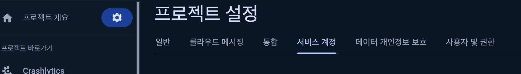 FIREBASE_SERVICE_ACCOUNT라는 Secret 값을 확인하는 방법은, 파이어베이스 콘솔에서 프로젝트를 선택한 다음, 기어 아이콘을 클릭하고 서비스 계정 탭을 선택한다.