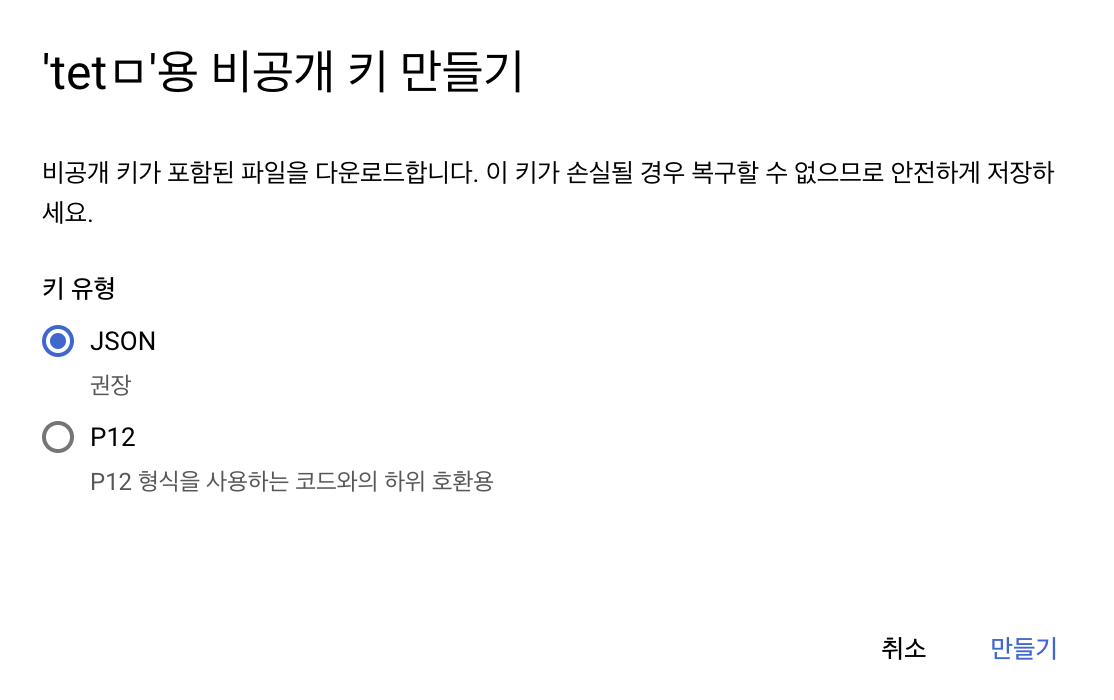 그러면 처음에 JSON 라디오 버튼이 선택된 상태로 만들겠냐는 팝업이 표시될 것이다. JSON 키가 필요하기 때문에 그대로 만들기 버튼을 누르면 된다.