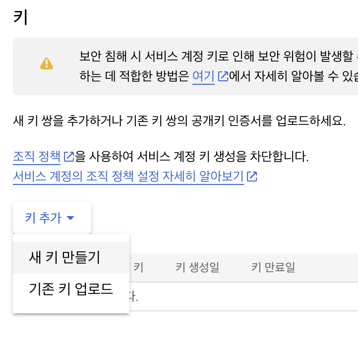 그러면 이 서비스 계정이 가진 키들을 볼 수 있는데, 방금 만들었으니 당연히 아무것도 없을 것이다. 그러니 새 키를 만들어준다.