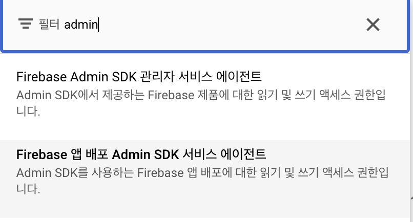 역할 선택 드롭다운을 누른 다음, 나타나는 필터에 admin을 입력한다. 그 후 Firebase 앱 배포 Admin SDK 서비스 에이전트를 선택한다.