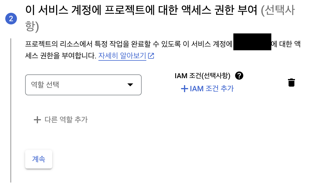 서비스 계정 이름 입력란에 적절한 이름을 입력한다. 그러면 서비스 계정 ID는 자동으로 생성된다. 서비스 계정 설명은 옵션이니 쓰고 싶으면 쓴다.