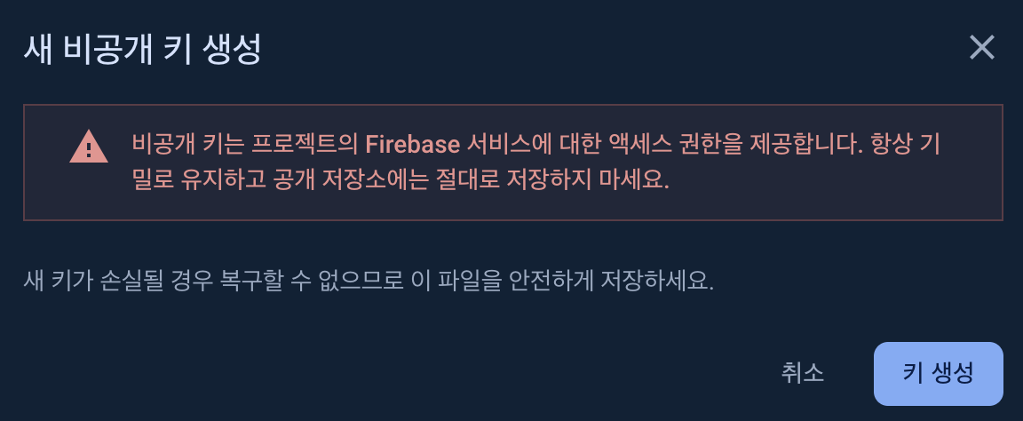 그러면 화면 하단에 새 비공개 키 생성 버튼이 보인다. 이걸 누르면 경고 팝업이 표시되고, 키 생성 버튼을 누르면 마찬가지로 파일이 다운로드된다.