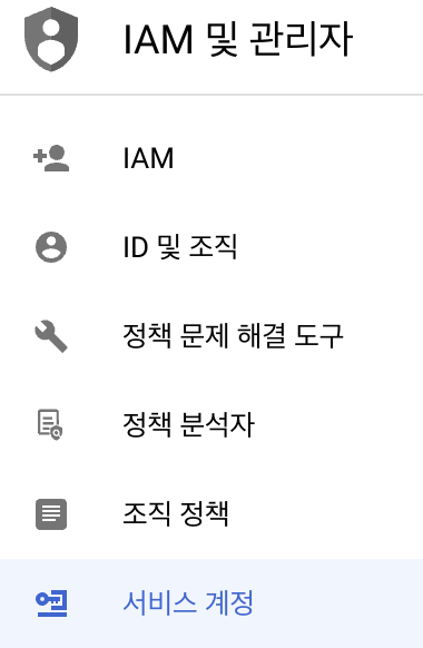 파이어베이스 등록을 마쳤다면 구글 클라우드 플랫폼에서 IAM 및 관리자 메뉴를 선택한 다음, 서비스 계정을 클릭한다.
