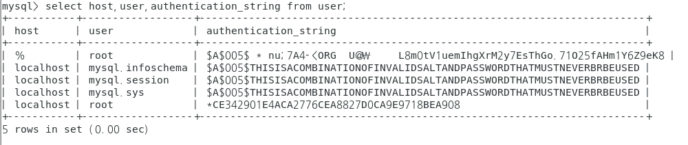 select host, user, authentication_string from user;는 현재 MySQL의 계정(user) 정보를 확인하는 SQL문이다.
