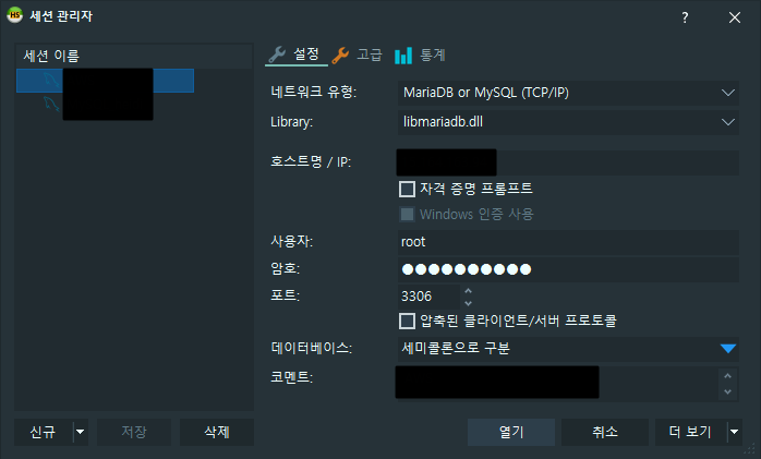 여기까지 다 입력했고 왼쪽 세션의 이름도 정해서 열기를 눌렀다면, 정상적으로 MySQL과 연결됐을 경우 이 화면이 나온다.