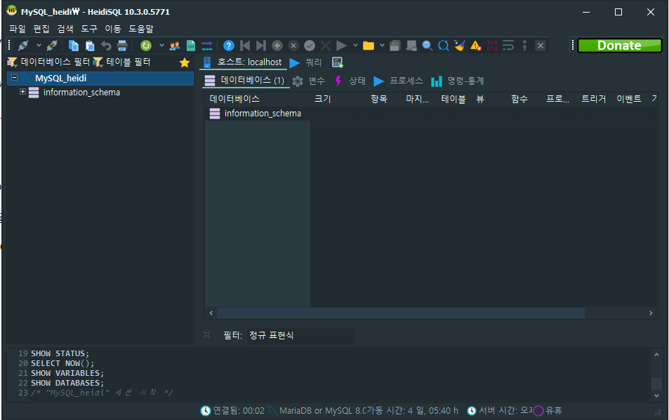 이 화면이 뜬다면 하이디SQL과 MySQL 연동은 성공한 것이다.