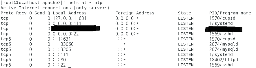 80, 3306, 33060 등의 포트와 각 ip별로 LISTEN이란 글자가 떠 있는 걸 볼 수 있다.