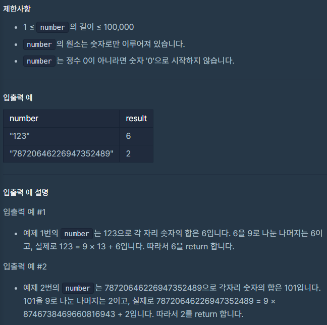 음이 아닌 정수를 9로 나눈 나머지는 그 정수의 각 자리 숫자의 합을 9로 나눈 나머지와 같다고 알려져 있다. 이걸 이용해서 음이 아닌 정수가 문자열 number로 주어질 때, 이 정수를 9로 나눈 나머지를 리턴하는 함수를 완성하라