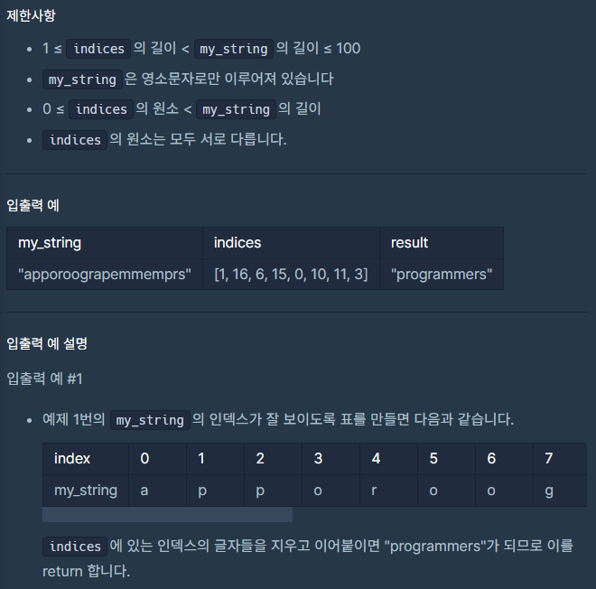 문자열 my_string, 정수 배열 indices가 주어질 때 my_string에서 indices의 원소에 해당하는 인덱스의 글자를 지우고 이어 붙인 문자열을 리턴하는 함수를 완성하라