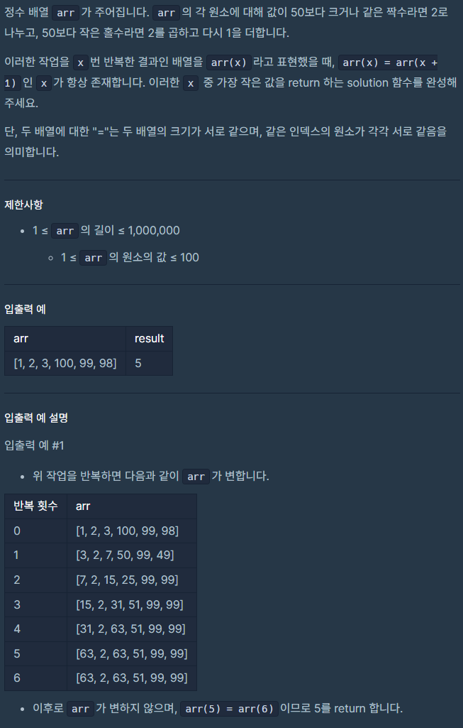 배열의 원소들이 규칙에 의해 변환되지 않을 때까지 변환됐다면 break로 무한 while문을 통과한 후, count를 리턴한다.