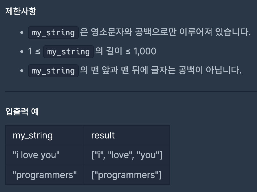 단어가 공백 1개로 구분된 문자열 my_string이 주어질 때 my_string에 나온 단어를 앞에서부터 순서대로 담은 문자열 배열을 리턴하는 함수를 작성하라
